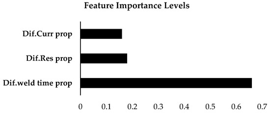 In the feature importance plot (see Figure 11), “Dif.weld time.prop” is the most critical feature, followed by “Dif.Res.prop” (difference ratio between actual and reference resistance value) and “Dif.Curr.prop” (difference ratio between the actual and reference welding current value).