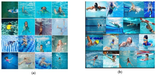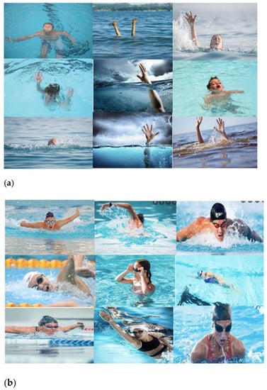 Our dataset contains 200 images that were collected through the Google search engine. The data consist of two classes (drowning and swimming), where each class includes 100 images representing swimmers from both genders but different ages. We used 100 of these images (50 drowning and 50 swimming) for model training and validation, while the other 100 images (50 drowning and 50 swimming) were used for model testing. The training and validation dataset was further split into 70% for training and 30% for validation. Samples of the drowning and swimming images are presented in Figure 1.