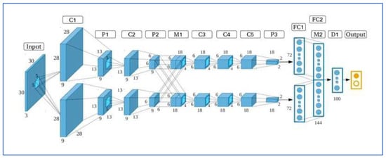 AlexNet was one of the first deep convolutional networks that reached significant accuracy [5]. The overfitting problem is solved in AlexNet by using dropout layers, where a connection is dropped with a probability of 0.5 during testing. A probability of 0.5 was chosen since it was the best fit for the network parameters and training options. Although this prevents the network from overfitting by allowing it to escape from undesirable local minima, it also doubles the number of iterations required for convergence. Millions of images have been classified using this algorithm into object categories, such as faces, fruit, cups, pencils, and animals. Networks take images as input and assign labels for those objects. In addition, they take probabilities for the categories in which those objects fall. There are two sets of images involved with the input to the network: 227 × 227 × 3 RGB images [24,25,26,27]. The AlexNet architecture is shown in Figure 2.