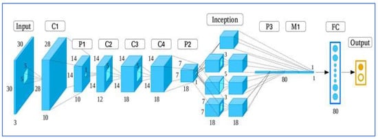 The inception module in the GoogleNet design solved most of the problems that huge networks faced [6]. GoogleNet has an error rate of 6.67%, which is very close to human performance. The design consists of 22 deep CNN layers, lowering the number of parameters to four million (60 million compared to AlexNet). In addition to the 22 layers of GoogleNet, there are five pooling layers [28]. The initiation modules comprise nine linear layers altogether. There are also 1 × 1 convolution filters. In part due to the parallel network implementation and layer reduction, the network has very good computational and memory efficiency. The model size is also smaller than other networks [24,27]. The GoogleNet architecture is presented in Figure 3.