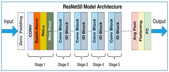 ResNet was developed in 2016 by introducing some features that significantly increase network accuracy and speed [9]. Not every neuron in the ResNet design needs to fire at once. After learning a feature once, it does not try to learn it again; instead, it focuses on learning additional features. This strategy enhances the effectiveness of model training. The ResNet50 network consists of 50 layers, and its architecture is illustrated in Figure 6.