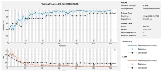 We examined five different pretrained CNN models. We started with GoogleNet training, as shown in Figure 7, which required a total of 60 epochs with two iterations per each epoch for a total of 120 iterations for the network to properly train and validate the data. It achieved a validation accuracy of 91.67% after 120 iterations. The network training took 3 min and 36 s to complete. Furthermore, the validation was carried out in a five-iteration process to verify that the system was well trained, while avoiding overfitting of the data.