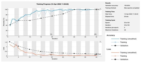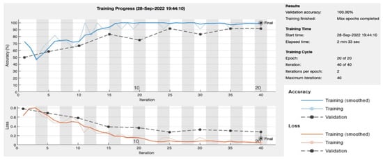 To train SqueezeNet, we used a total of 20 epochs with two iterations per each epoch, as shown in Figure 8. The model achieved a validation accuracy of 100% after 40 iterations, which is ideal accuracy and indicates a well-trained network. The training procedure took only 26 s, which was significantly less time than the other two networks. To avoid data overfitting, the validation frequency was also performed in a five-iteration process.