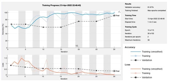 However, there were 15 epochs overall for training AlexNet (Figure 9), with two iterations per epoch, allowing the network to train and validate the data extremely successfully. It attained a validation accuracy of 91.67% after 30 iterations. The network training took 1 min and 5 s to complete, and the validation was carried out through a five-iteration process.