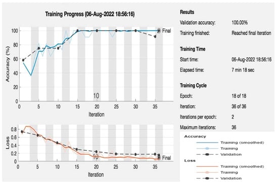 As shown in Figure 10, we used a total of 18 epochs with two iterations for each epoch to properly train and validate the data for ShuffleNet. After 36 iterations, we achieved a prediction performance of 100%, which is optimal accuracy and suggests a well-trained network. Exactly 7 min and 18 s were needed for the training process, far slower than the time required for the three previous networks. The validation frequency was also carried out using a five-iteration process to prevent data overfitting.