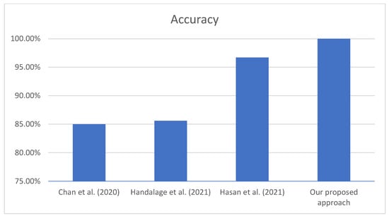 For further evaluation of our proposed approach, we compared it with other current approaches. The accuracy, machine learning technique, and dataset size of the various systems currently in use are compared in Table 9 and Figure 13. Although it was trained on a smaller amount of data, our proposed approach outperformed other existing approaches in terms of accuracy, as illustrated in Table 9 and Figure 13.
