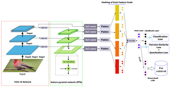 The approaches above use one type of feature, mostly features from the last FC layer (high-level features). However, different types of features need to be extracted to create a more complete description. Many methods have been proposed for multi-level image retrieval. Lin et al. proposed a DDH [47] method for image retrieving. The authors combine end-to-end learning, divide-and-encode, and hash code learning into a single framework. Specifically, the stack of conv-pool (convolution pooling) layers was then used to acquire multi-scale features. By combining the third pooling layer’s and fourth Conv layer’s outputs. In [48], Yang et al. proposed a Feature Pyramid Hashing (FPH) as a two-pyramids (vertical and horizontal) image hashing architecture to learn the subtle appearance details and the semantic information for fine-grained image retrieval. Ng et al. [49] developed a novel multi-level supervised hashing (MLSH) technique for image retrieval. The authors built and trained the tables individually, utilizing different levels of features (semantic and structural).