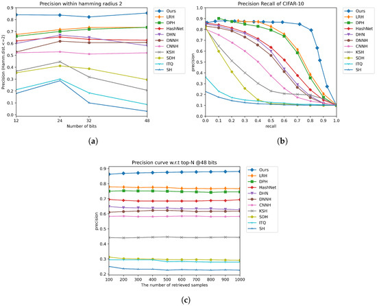 The comparison results on the CIFAR-10 dataset under three evaluation metrics. (a) Precision within hamming radius 2. (b) Precision recall curve on 48 bits. (c) Precision curve w.r.t top-N @48 bits.
