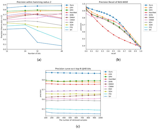 The comparison results on the NUS-WIDE dataset under three evaluation metrics. (a) Precision within hamming radius 2. (b) Precision Recall Curve on 48 bits. (c) Precision curve w.r.t top-N @48 bits.