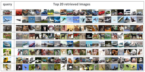 Moreover, the retrieval accuracy for CIFAR-10 dataset is shown for different categories of images as illustrated in Figure 4. For this example, we have proved that we can remove the irrelevant images by using our DFPH approach. Figure 4 shows the top 20 retrieved images from CIFAR-10 dataset by DFPH with 48-bit hash codes. The first column shows the query images, the retrieval results of DFPH are shown in other columns.