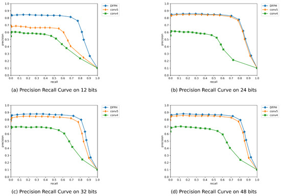 We further demonstrate the efficiency of our method by comparing its precision–recall and precision with respect to top returned samples with other methods in Figure 2b,c and Figure 3b,c, respectively. From Figure 2c and Figure 3c, it can be seen that the proposed DFPH method achieves the best precision with 48 bits when the number of return samples is from 100 to 1000. From Figure 2b and Figure 3b, our DFPH achieves substantially high precision at a low recall level, which is required for precision-first retrieval, and widely used in practical systems. Generally speaking, our method DFPH has better performance than the compared methods.