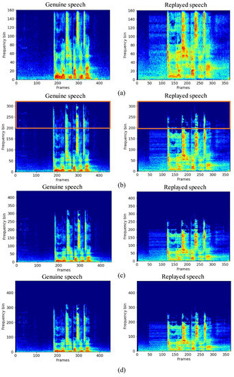 The spectral difference between genuine speech and replayed speech at the sampling rate between 16 kHz—48 kHz. (a–d) are the spectrum at different sampling rates of 16 kHz, 32 kHz, 44.1 kHz, and 48 kHz, respectively.