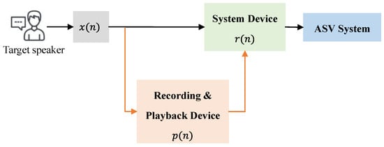 According to the generation process of the replayed signal, as shown in Figure 2, three terminal acquisition devices are necessary, namely: system device, recording device, and playback device. The system device is the microphone of the ASV authentication system, which is deployed to collect the voice to be authenticated from the target speaker.