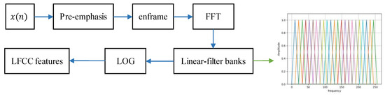 To verify the detection performance of replayed signals at high sampling rate, linear-frequency cepstral coefficients (LFCC) with uniform distribution of linear-filter banks are selected as front-end features. The LFCC feature is used specially to express the spectral difference between the genuine signal and the replayed signal at different spectrums. The speech signal is split using “Hamming” window with 20 ms and step-size of 10 ms, and 23 linear-filters are applied. The extraction process of LFCC features is shown in Figure 6.