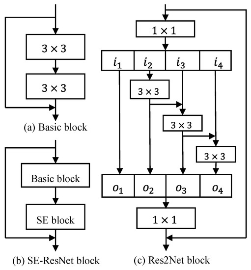 The different structures in the modules: (a) basic block; (b) SE-ResNet block; (c) Res2Net block.