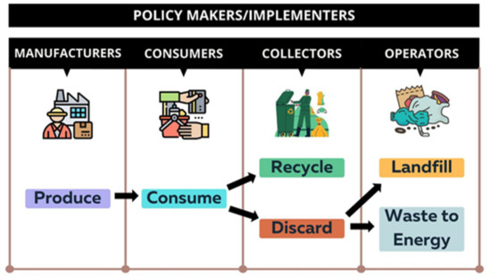 Options for processing and treatment of waste involving actors (i.e., manufacturers, consumers, collectors and operators) [5].