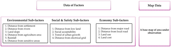 Data acquired by the proposed system include data factors and sub-factors as well as a base map of location (adopted and modified from Nanda et al. [4]).