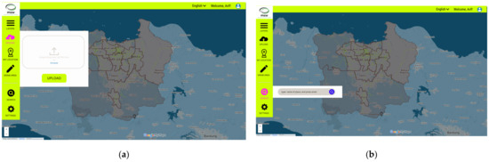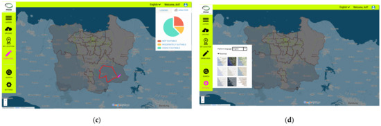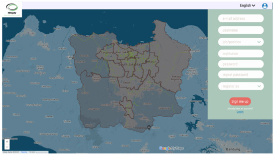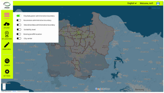 The prototype implementation is the construction and integration of the functional system components that comprise the proposed system. Figure 4 represents the system user interface, which provides login and registration facilities for registered and new users, respectively. A user must be registered and logged in to enter the application system and can select the role of an administrative, expert, or system user. Users are provided with the relevant menu after logging in, as shown in Figure 5. Afterward, they can select the layer to display or upload data, search for the target area, and draw the area for site suitability analysis, as shown in Figure 6. Several layers can be activated by users namely administration (from village level to city level), suitability layer, existing landfill location (represented as a point), and city. This makes the system scalable to the wider area of Jabodetabek in the vicinity of Indonesia’s capital as the case study area. Moreover, uploaded data on the system must be shapefile data in zip format.