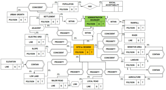 - Calkins, H.W. Entity relationship modeling of spatial data for geographic information systems. Int. J. Geogr. Inf. Syst. 1996, 10, 1–18. [Google Scholar]