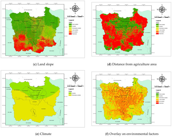 Figure 11 shows the appearance of the suitability map for all subfactors consisting of environmental factors. The suitability display for an environmental factor (Figure 11f) is obtained by superimposing all of its subfactors including (a) distance from settlements, (b) distance from rivers, (c) slope of land, (d) distance from agricultural areas and (e) climate.