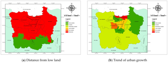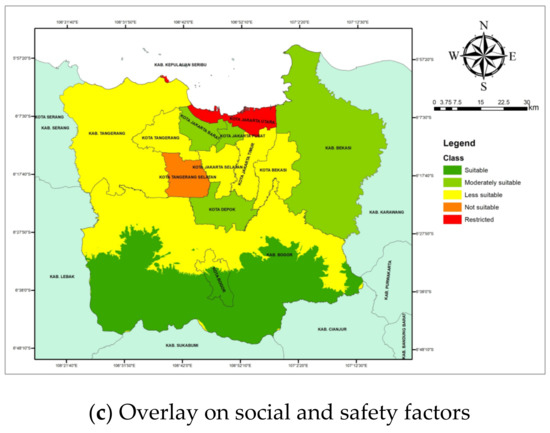 The view of suitability maps of all subfactors comprising the social and safety actor is depicted in Figure 12. The suitability view of social and safety factors (Figure 12c) is obtained by overlaying all of its subfactors including (a) distance from low land and (b) trend of urban growth.