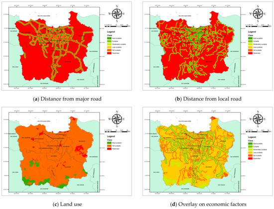 Figure 13 shows the suitability maps of all subfactors comprising the economic factor. The suitability view of the social and safety factors (Figure 13d) is obtained by overlaying all of its subfactors namely (a) distance from major road, (b) distance from local road, and (c) land use. The final suitability map representing the overlay of all factors including environmental, social, safety, and economic, is depicted in Figure 14.