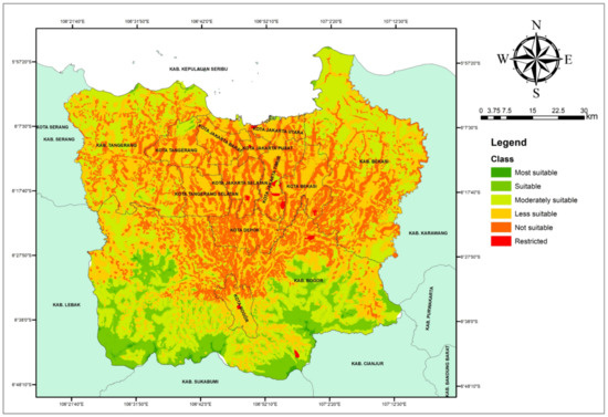 Referring to Figure 14, the most suitable area is Bogor Regency, Southern Jabodetabek. Table 1 shows more detailed information on the footprint area for energy generation from MSW (in ha) per suitability class. Based on the analysis, the most suitable area for energy generation is in the Bogor area, which is 3096.87 ha. One of these locations is in Nanggung District, Bogor. Compared to other regions, most of the Bogor area is still underdeveloped and dominated by rural areas, with vacant land which are suitable for energy generation. This implies that the TPA to generate energy from urban waste in the Greater Jakarta area must be located in Bogor.