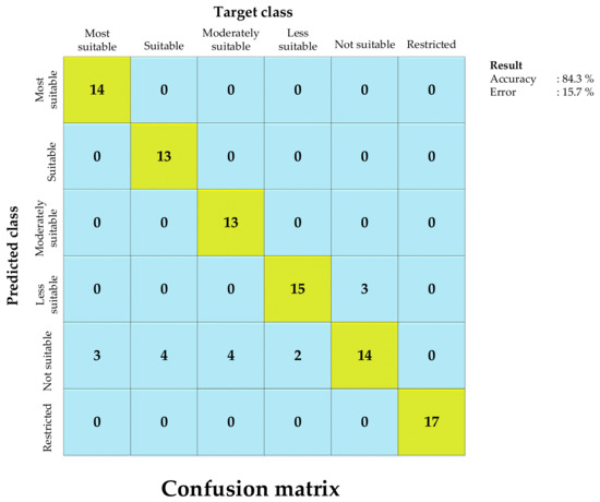 The evaluation is an important stage in assessing the reliability of a system, in general, field validation is very important in determining the location. Meanwhile, each location must be checked for conformity between the modeling results and the reality in the field. Modeling errors can occur due to data not being updated, sudden disasters, and major developments. This study compares the final overlay map and field validation, a total of 102 location points with 17 points for each class were ground-checked in the field regarding the level of conformity with the system output. The latest satellite imagery by Bing Aerial from Microsoft Bing was used to validate several parameters such as distance from settlements and rivers on environmental, social and security, as well as economic subfactors. This validation is displayed in a connection matrix (Figure 15) with an accuracy value and error as evaluation metrics. Based on the evaluation analysis, the suitability map for energy generation has an accuracy of 84.3% and an error of 15.7%. This error may be caused by using less updated map data. This study used the 2020 map, which allows land use changes to occur during that period, culminating in a discrepancy between the final map overlay and land validation. However, this system still has a fairly good performance and accuracy value.