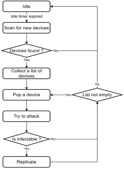 Gonzalez and Larraga et al. [46] suggested a CA-based two-dimensional model based on an epidemiological compartmentalized model to examine the transmission of Bluetooth worms. According to related research, there are seven different smartphone prevalence states: vulnerable, exposed, infected, diagnosed, carried, interrupted, and recovered. When considering homogenous smartphones, a set of local rules was created to mimic the dynamics of the model. The model has recently expanded to assess the potential for recovering and running antivirus updates and their effect on worms. To evaluate how Bluetooth malware spreads under various circumstances, the presented model does not consider additional aspects that may affect worm propagation, such as user interactions, human behavior, and malware transmission characteristics. This study also evaluated transmission ranges of 1, 10, or 100 m caused by various Bluetooth antenna types, transmission acceptance, and discoverable patterns resulting from direct user engagement. Bluetooth worms use Bluetooth as their propagation method. This short-range communication method heavily influences propagation behavior. It is proximity-based, bandwidth-limited, and can be in constant motion [4]. Figure 1 illustrates the cycle of a Bluetooth worm during infection.