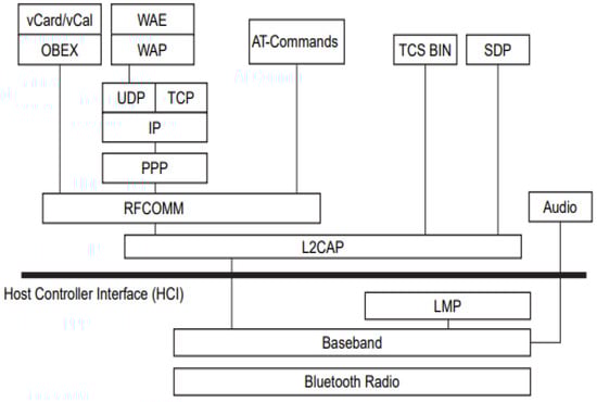 There is a generic Bluetooth stack called BlueZ [47,48,49] for implementing the Bluetooth Hosting Protocol stack on Linux. It is the official Bluetooth stack for Linux and is a free-source software. BlueZ is a Linux Bluetooth stack that maps the Bluetooth protocol layer to user space daemons, kernel modules, kernel threads, configuration tools, utilities, and libraries. These components work together to provide a complete Bluetooth stack for Linux. The Bluetooth protocol stack comprises a controller chip and the corresponding host machine. A USB or UART interface connects a Bluetooth hardware device to the host. The Linux kernel communicates with the device through the host controller interface (HCI) by sending HCI packets to and from the hardware controller, as shown in Figure 2. The Bluetooth controller then creates a radio signal generated using an Asynchronous Connectionless Link (ACL) or Synchronous Connection-Oriented Link (SCO) in the baseband. SCOs are used for latency-sensitive applications that do not require a lossless data transfer, such as hands-free audio.