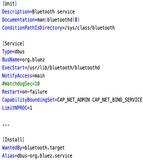 Simplified bluetooth.service unit file. In this figure, the syntax is shown in blue, while the comments are shown in green.