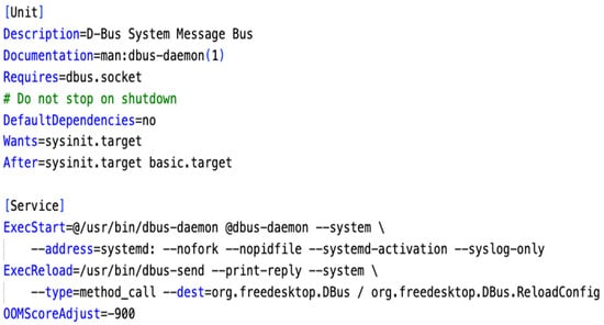 Figure 5 and Figure 6 are the socket and service unit files for the D-Bus system message daemon. The socket unit creates a socket file placed in /run/dbus/system_bus_socket using the ListenStream variable. Systemd system services heavily use the D-Bus system message bus, so it depends on the sysinit.target. Note that the service type is not specified. Its service type is “simple”, not dbus, because it is the one that manages the D-Bus. The same is true for the session bus. The dbus.service depends on dbus.socket, and dbus-daemon contains the dbus, acting as a middleman to pass dbus messages from one to another. The out-of-memory killer’s tweak level is set to −900, which makes it very unlikely that OOM will kill the system bus dbus-daemon.