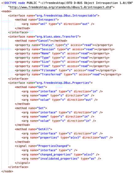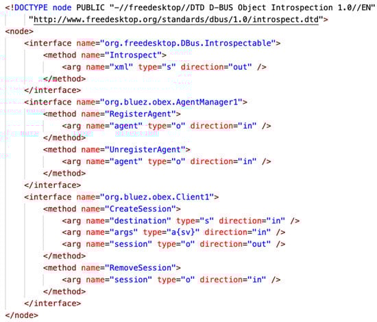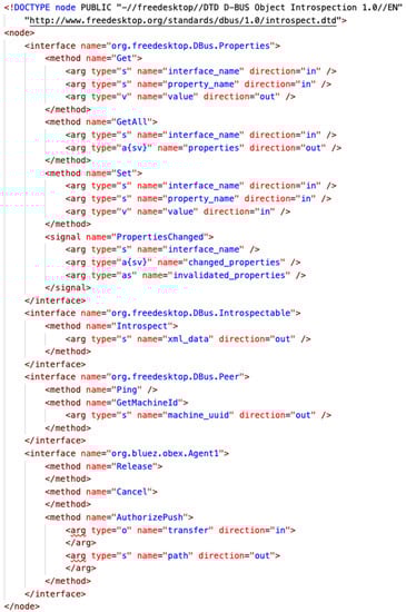 Interfaces of the D-Bus object “/com/bluez/obex”. The HTML tag is written in a dark red typeface; the attribute name and value are in red and blue, respectively.