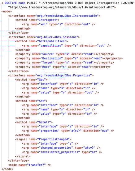 When obexd receives a push request for an OBEX object, it first creates a session object, as shown in Figure 10, and a transfer object, as shown in Figure 11, then calls the AuthorizePush method of an existing OBEX agent to confirm whether to accept or reject the request. If the agent agrees with the recommendation, it returns a path where obexd will store the file. The object push starts the transfer of the file and simultaneously updates the properties of the transfer object to reflect the transfer status. On each update, the transfer object will fire a PropertiesChanged signal. The OBEX agent listens for this signal, waits for the file transfer to complete, and retrieves the file.