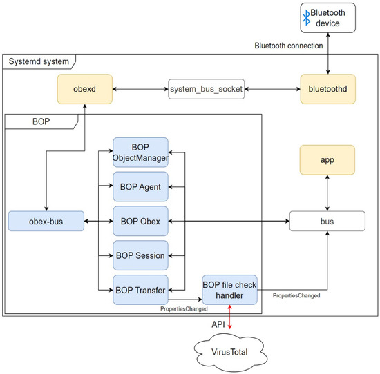 The novelty of the BOP approach lies in the fact that it is the first proposed centralized proxy to filter malicious files transferred through BlueZ’s OBEX system service. Traditional approaches usually require each device to run its security software, which makes the device’s security dependent on the device manufacturer’s security capabilities. The BOP approach improves security and reliability by centralizing security checks in a single agent. The BOP approach can improve the security of Bluetooth devices by impacting the following areas, reducing the risk of Bluetooth devices being attacked by malicious files. We created a proxy service called the BOP on the D-Bus message bus to intercept all messages between the server and client processes of the BlueZ OBEX service. The messages proxied by the BOP are then used to filter malicious files transferred to the device using the VirusTotal APIs. To further restrict access to temporary files, create a dedicated user account to run a centralized OBEX service for each user on the system. It will allow for more granular control over who has access to temporary files and will help mitigate the risk of unauthorized access. A proxy can be also created to route requests between two message buses. It can be used to improve performance and security by ensuring that requests are routed through a secure channel. It is a proxy that can be also created between Bluetooth and obexd daemons. It can be used to intercept the sockets passed to obexd, and to filter packets based on their content. It can help to prevent malicious packets from being sent to obexd, and can help to protect the system from attack. Finally, a proxy can be used to deny or allow access to services for which users originally have or do not have permissions. It can implement a more granular access control policy and help protect the system from unauthorized access.