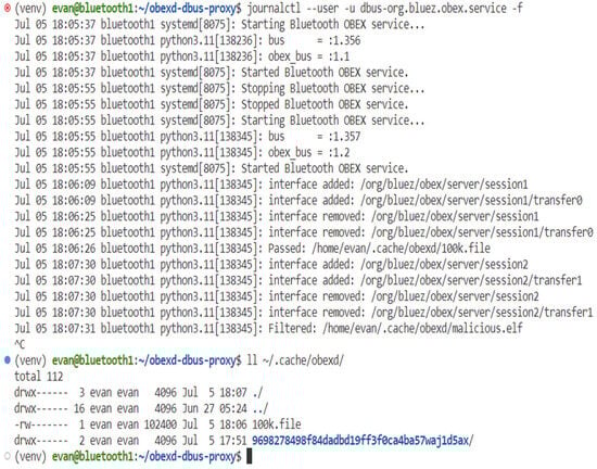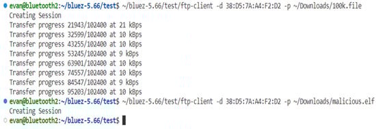 FTP is tested using the FTP client Python script provided by BlueZ. A standard file (100k.file) and a malicious file (malicious.elf) are sent to another Bluetooth device in Figure 18. Figure 19 shows the service log of the BOP, which shows that 100k.file passed the filter while malicious.elf did not. Below the service log is a “ls” command output showing that only 100k.file exists.