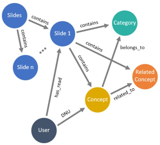 Our main goal is to automatically construct an EduKG for the learning material in CourseMapper. CourseMapper is a MOOC platform that we developed to help learners effectively create and manage courses, collaborate with each other, and interact with learning materials using shared annotations []. Generally, an EduKG on top of a MOOC platform is a heterogeneous information network consisting of different entities and relationships between them. Concepts represent important entities to be modeled in any EduKG in order to provide an overview of the main concepts in the learning materials, help learners be aware of what is to be learned, and draw their attention to the most crucial concepts. Consequently, this facilitates the learners’ achievement and creates a positive perception of the materials []. In addition to concepts, the EduKG normally contains other entities, such as learners, teachers, courses, and videos, as well as the relationships among those entities. Figure 1 shows a part of the network schema of our EduKG in CourseMapper with different entity types and the semantic links between them. This part of the EduKG consists of five types of entities, namely the user, learning material (slides or video), concept, related concept, and category, as well as the relationships between these entities.