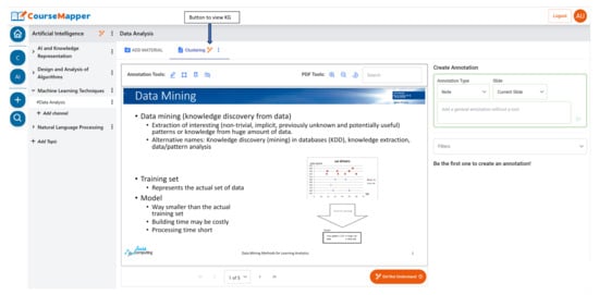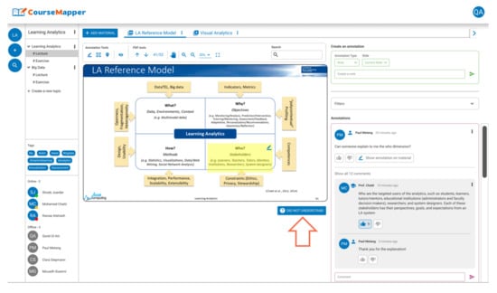 - Ain, Q.U.; Chatti, M.A.; Joarder, S.; Nassif, I.; Wobiwo Teda, B.S.; Guesmi, M.; Alatrash, R. Learning Channels to Support Interaction and Collaboration in CourseMapper. In Proceedings of the 14th International Conference on Education Technology and Computers, Barcelona, Spain, 28–30 October 2022; pp. 252–260. [Google Scholar]