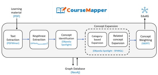 Several research studies have used direct entity linking via named entity recognition (NER) [,,] and entity-linking services [,,,,,,,]. It is a common practice to use entity linking to identify concepts from the text. However, applying entity linking to learning materials with a large amount of text is not efficient, as this step requires sending multiple requests to an entity-linking service. To overcome this issue, few works have focused on first extracting keyphrases from the text and then using these keyphrases to identify concepts. These works have employed various machine learning methods, such as rule-based learning [], supervised learning [], unsupervised learning [], and deep neural networks [,].