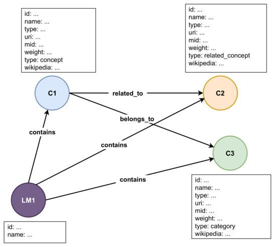 Figure 4 shows the illustration of the KG stored in a graph database. There are four types of nodes to be observed: The learning material LM1, which contains a concept C1, a related concept C2 and a category C3. Supposing that following the expansion and weighting steps, concept C1 is found to be related to C2 and is categorized under C3 and, thus, added to the KG, relationships of the type related_to and belongs_to are created between C1 and C2, and between C1 and C3, respectively.