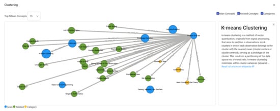 The embedding of the content of the learning material and the embedding of the content of the concept (i.e., the text content of its Wikipedia article) are defined using SBERT. To retrieve the Wikipedia article text, the Wikipedia API (https://pypi.org/project/Wikipedia-API/, accessed on 1 August 2023) is used. Then, the weight of the concept in the learning material is computed as the cosine similarity score between and .