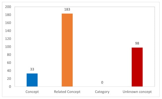 Figure 7 shows the distribution of concepts in the CCI dataset when we map the experts’ annotated concepts to the concepts, related concepts, and categories identified by our approach. Most of the concepts annotated by the experts are related concepts (183). None of the annotated concepts in the dataset is of the category type; 98 concepts (unknown concepts) annotated by the experts have not been identified after our concept identification and expansion steps. Based on the results obtained during the experiments for the top 3, 5, and 10 ranked concepts, it is observed that our strategy (marked in bold in Table 4) is more precise than the other strategies, as the precision for all top k-ranked concepts is higher (see Table 4, without harmonic mean). In particular, for the top 10 ranked concepts, demonstrates improvement over the strongest baselines (underlined in Table 4) w.r.t precision by 17.8% and w.r.t the F1-score by 14.5%. This shows that is the better strategy for selecting a high number of concepts. Despite the higher precision of our strategy, , shows better recall and an F1-score for the top three and top five ranked concepts. This can be explained by the fact that during the annotation of concepts, the experts focused more on the diversity of the concepts in the learning resource collection. Another explanation for these results is that, while in our approach, concepts were identified from only the top 15 keyphrases extracted from the learning resource, Manrique et al. [] did not use an intermediate keyphrase extraction module in their experiments but directly fed the learning resource content to the DBpedia Spotlight, which resulted in a higher count of identified concepts.