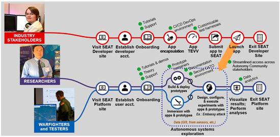 MITRE began the Simulation, Experimentation, Analytics, and Testing (SEAT) project by conducting a requirements definition process that involved developing high-level technical and user-oriented requirements via the construction of scenario-based Journey-Maps. It was well-understood that simulations can play a critical role in the exploration of next-generation concepts of operation and the employment of emerging autonomous and artificially intelligent capabilities. However, rather than simply filling an identified gap in simulation-based environments, the team desired a deeper understanding of the different user roles that should be accommodated in such an environment. This is in alignment with the NATO MSG-136 MSaaS framework [23,24] that specifies the Allied Framework for M&S as a Service, focusing on the importance of the linkage between the providers and the end-users. MITRE’s operational space involves multiple stakeholders, and consequently, a Journey-Map-focused approach addressed a common problem across multiple projects.