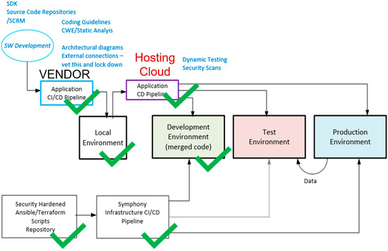 The identification of the hardware infrastructure layer highlights the need to isolate applications from specific hardware dependencies and limit those dependencies as much as possible. This also accounts for specific requirements to support GPU or high-performance computing (HPC) hardware, and SEAT can interoperate with those applications; however, the focus is to use standards-based APIs for operating system interfaces to minimize the special cases. Applications integrated within the SEAT environment include both Linux- and Windows-based applications that run on commercial hardware. This layer is invoked from the layer above it (see Figure 3), namely the Cloud Platform layer, implemented as Platform-as-a-Service (PaaS). A MITRE product, namely MITRE Symphony™ [31,32,33], is used for IaaS functionality.