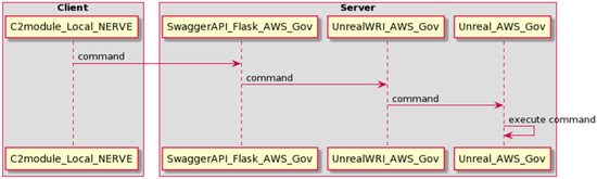 The API architecture developed for this capability is designed in a layered fashion, where one REST service calls the other. The first layer of the REST service is what the user interacts with directly. This is the Command and Coordination Behavior Service API Layer (MaaS depiction in Figure 1). It is implemented as a Python Flask application deployed on an AWS GovCloud machine (Figure 10). This REST service defines higher-level behaviors that the user can invoke to issue a variety of commands that are sent into the Unreal simulation. These include behaviors such as having the leader vehicle perform a patterned movement such as a box or circle pattern. The logic for calculating the waypoints in the movement patterns is defined within the REST service as opposed to in the Unreal simulation. This decoupling of the vehicle logic from the simulation provides an example of how the capability can be expanded by defining new behaviors within the first-layer REST service without having to change anything within the simulation itself.