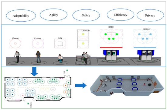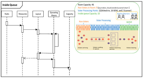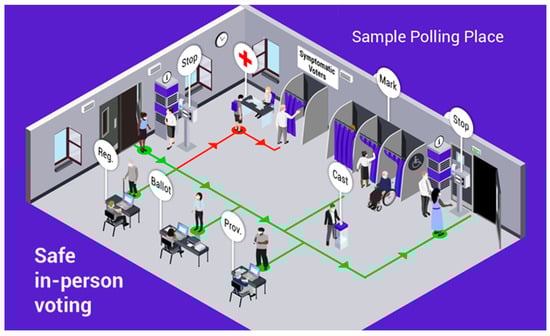- Polling layout and management. While the efficient and effective allocation of resources is necessary to minimize waiting time, the finite nature of resources and inevitable variability in voter arrivals or service times will inevitably result in queueing for some voters at various times of the day. Thus, polling managers must decide how to best allocate scarce resources to provide the best overall performance throughout layout constraints. Recently, some researchers found that tools that are based on the science of queuing theory can help election and polling managers understand the various trade-offs involved in allocating resources and make the tough decisions that face them [17]. In addition, researchers indicate that layout and path directionality significantly affect average voter travel distance, with the perimeter layout having a unidirectional path being the most efficient [18]. Also, COVID-19 added extra problems to polling places and caused extra attention to layout configuration [19], queue length, and polling workers [2]. Figure 2 shows a schematic of a polling location considering social distancing, safety, and privacy.