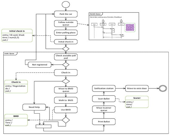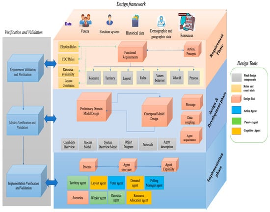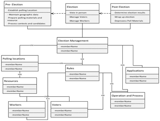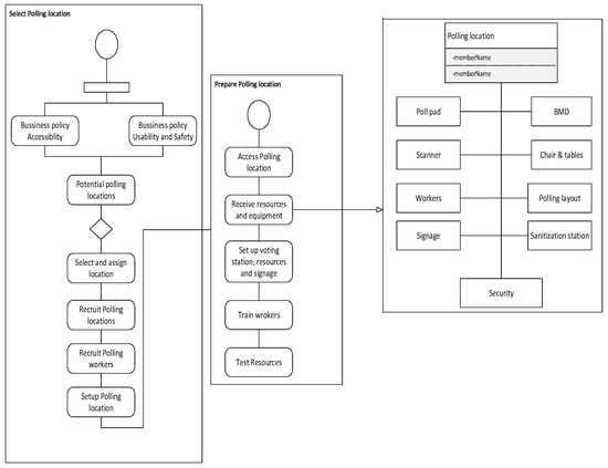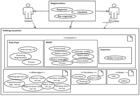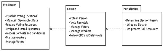 - The system requirement phase focuses on mimicking the election specification and captures holistically the difficulties that potentially need to be improved. It identifies the goals, basic functionalities, and requirements of the system along with the inputs such as election rules, CDC rules (Centers for Disease Control), layout constraints, and resource availability, which are extracted from historical and available data. The output of this phase includes territory specification, layout specification, logistic specification, process specification, and system goals. The system requirement defines the players participating in the system, describes the scenarios of participation by defining the initial functionality descriptors, and, finally, identifies the system goals. The following figure (Figure 4) shows the three phases of each election, which are mimics of the existing process. The focus of the proposed platform is pre-election and election.