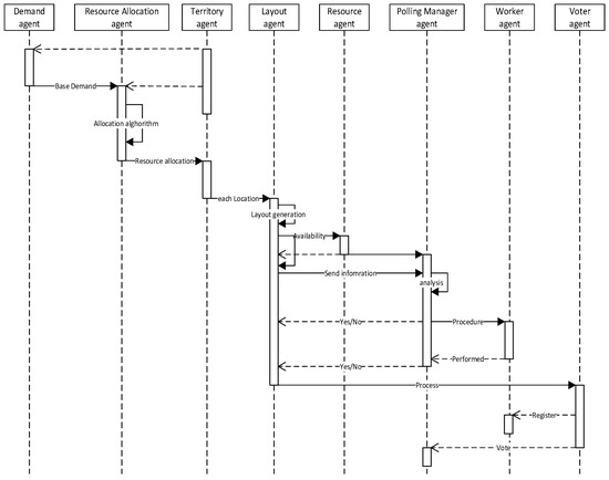| Layout agent | COA | Layout configuration, 3D layout, resource, and geographical data for each location | Territory agent | Polling manager agent, resource agent, worker agent, and voter agent |