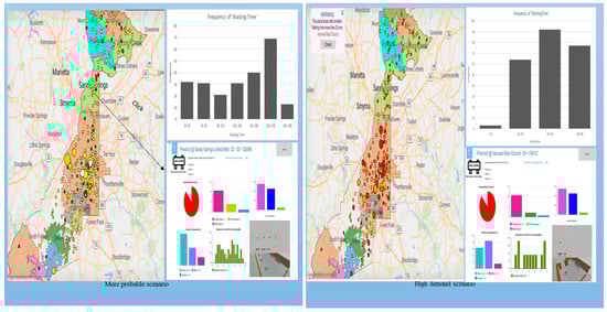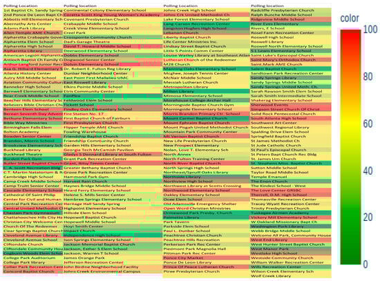 - Resource resources. The number of poll employees and voting resources (e.g., poll pads, ballot marking devices, and scanners) are key drivers of voting queues and velocity. Inadequate allocation results in excessive times, notably associated with uncertainty about time-phased voting demand per precinct, voting availability pattern disparities (e.g., blue vs. white collars and retirees), and overall voting turnout. Furthermore, allocation has to aim for geographic and demographic fairness in terms of home-to-vote time, notably avoiding situations where precincts with more minorities or people known to be partisan of a party experience longer wait times [12]. Results of previous election systems demonstrate that fairness in resource allocation at the county level is an important factor due to the limited number of resources allocated to each state [13]. For example, in Florida during the US 2020 election, certain polling locations had average wait times upwards of 80 min, while neighboring polling locations had waiting times of only 7–10 min. It should also be noted that some locations reported significantly higher voter turnout than other locations. In the state of Georgia’s 3 November 2020 election, some voters waited over five hours at Christian City, an assisted-living community south of Atlanta [14]. Other locations averaged less than five minutes. During the June 2020 primaries, about 11% of voting sites in Georgia closed over an hour late, according to an analysis by The Atlanta Journal-Constitution of the elections data [15]. The epicenter of voting problems was Fulton County, where more than three-quarters of polling places closed after 8 p.m. [16]. Figure 1 provides a visual representation of this phenomenon. This emphasizes the importance of rigorously analyzing differences in voter behavior.