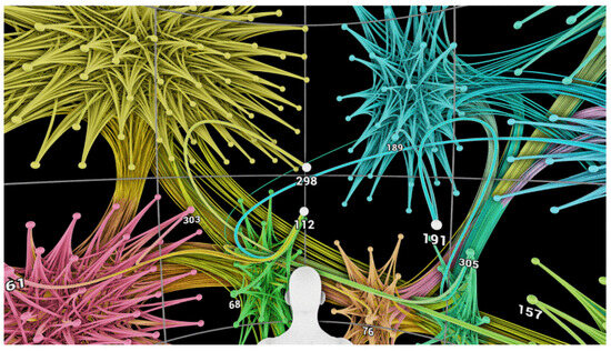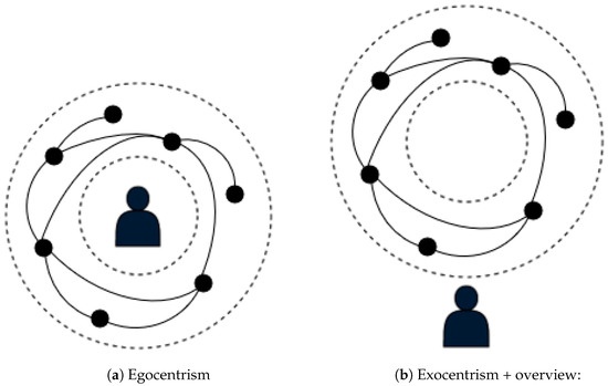 However, all these methods may be less practical for large graphs due to the lack of display space. One can notice the presence of many node and edge occlusions. Some methods [10,11] have been proposed to reduce the occlusion by clustering edges, while others have proposed to exploit 3D to distribute nodes well and to improve the perception of connectivity between nodes [12,13]. Methods exploiting 3D are limited when combined with a conventional environment (2D display), as depth cues in 3D can make understanding a large graph more complex [14]. Some works have suggested that immersion in the data can mitigate this complexity and make depth a viable channel for encoding data [15,16]. Thus, several methods for graph visualization in immersive environments have been proposed [17,18,19]. Most of these methods used an exocentric approach in which a user is outside the representation of a graph [20] to provide an overview of the graph, but some other works suggest that an egocentric approach may be useful for graph visualization [17]. An egocentric visualization of a graph involves placing a user, for example, a graph analyst, inside a graph. Other work argues that it can also increase user engagement and reduce the symptoms of cybersickness that can be observed with an exocentric approach [20,21]. However, a study by Yang et al. [22] showed that exploring maps from an egocentric perspective resulted in poorer performance than any other representation in an immersive environment.